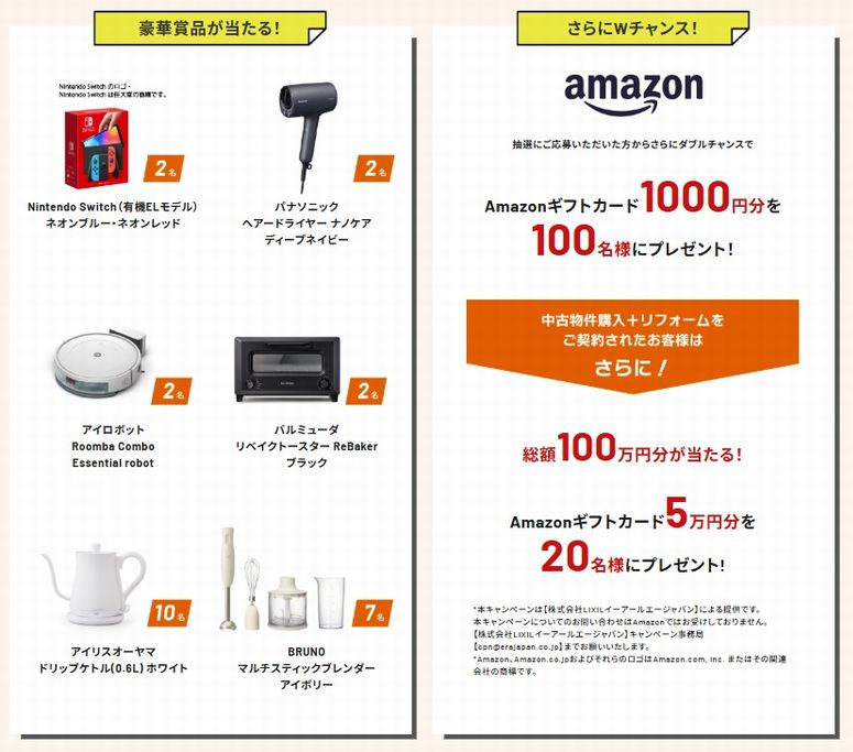 キャンペーン期間中にご来店・ご相談(物件見学・査定依頼)・ご契約されたお客様、そして中古物件購入相談+リフォームの見積・ご契約されたお客様の中から、それぞれ抽選で豪華賞品が当たるプレゼントキャンペーンです。