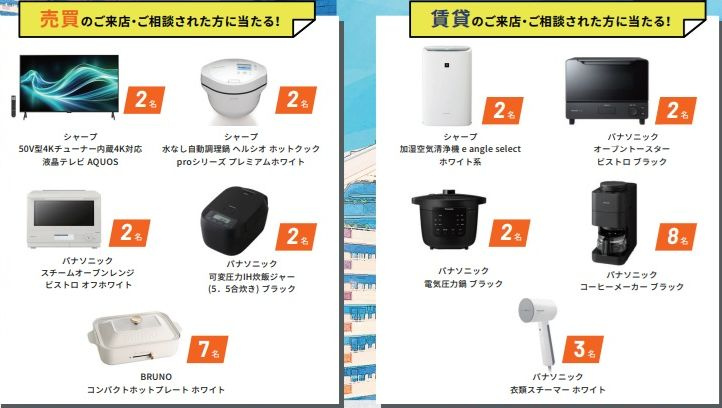キャンペーン期間中にご来店・ご相談(物件見学・査定依頼)・ご契約されたお客様、そして中古物件購入相談+リフォームの見積・ご契約されたお客様の中から、それぞれ抽選で豪華賞品が当たるプレゼントキャンペーンです。